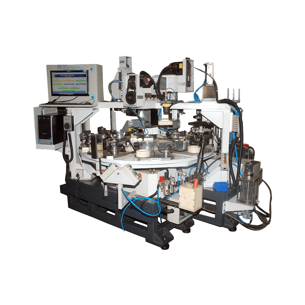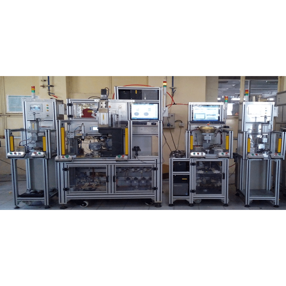 - Operations like auto feeding, pressing, tightening, auto glue dispensing, heating and testing. Part pressing with load & distance control. Servo drive assisted pressing. Laser marking on finished assembly. Real time monitoring of load vs distance etc.